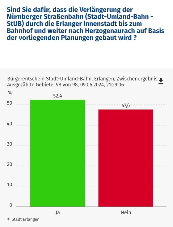 Das Ergebnis des zweiten Bürgerentscheids zur Stadt-Umland-Bahn in Erlangen steht fest: 52,4 Prozent der Erlanger Bevölkerung haben am 09.06.2024 für die Realisierung der StUB gestimmt.