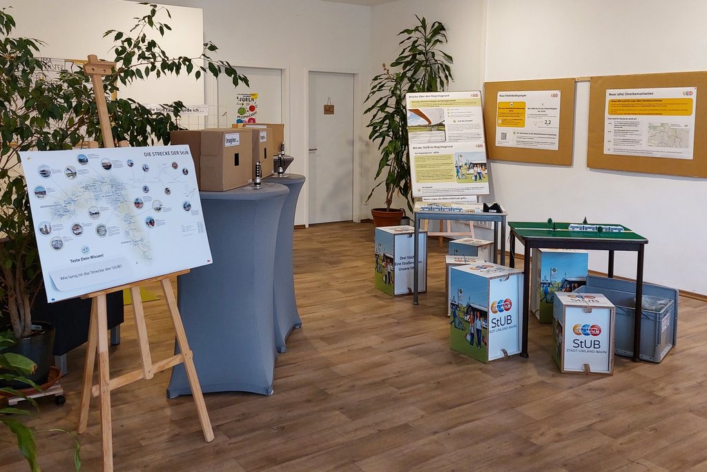 Noch bis 17. Juni 2023 findet die Ausstellung „Imagine StUB“ im Klimaschaufenster Erlangen statt. Neben vielen Informationen rund um die Stadt-Umland-Bahn warten verschiedene Mitmachaktionen auf Sie: Gestalten Sie mit uns das StUB-Mosaik aus Meinungen, Anregungen und Vorstellungen zur Stadt-Umland-Bahn oder bauen Sie mit Lego die optimale Staßenbahnhaltestelle. Vorbeischauen lohnt sich!