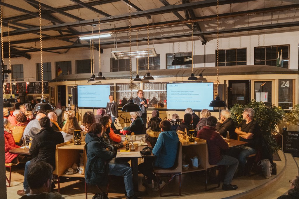 Um 17 Uhr leitete das Bimmeln der Historischen Straßenbahn in Nürnberg “Am Wegfeld” unser 16. Dialogforum zur Stadt-Umland-Bahn ein. Gemeinsam mit den Interessierten begaben wir uns auf eine Zeitreise in die Vergangenheit der Nürnberger Straßenbahngeschichte. 40 Minuten später erreichten wir das Historische Straßenbahndepot St. Peter, wo wir den Blick von der Vergangenheit in die Zukunft richteten. In den nächsten, rund 90 Minuten, betrachteten wir den aktuellen Planungsstand des L-Netzes, warfen einen Blick auf den Ostast und sprachen intensiv über den Nürnberger Streckenabschnitt. In der anschließenden ausführlichen Fragerunde hatte das Publikum vor Ort die Chance, mit den Mitarbeiterinnen und Mitarbeitern des ZV StUB ins Gespräch zu kommen.