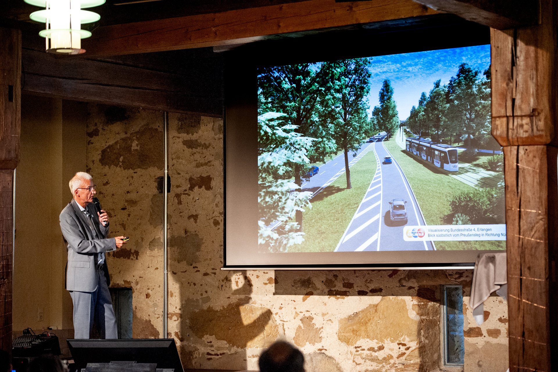 Nach einleitenden Worten zum L-Netz der StUB folgte ein Rückblick auf das, was bislang zur StUB im Schwabachtal passiert ist. 2018 gründete sich die Initiative StUB im Schwabachtal ("LIBOS"), bestehend aus 13 Gemeinden östlich von Erlangen und der Stadt Erlangen. Das Ziel: die Aktualisierung der Verkehrsanlagenplanung zur Ermittlung der Kosten, um den Ostast in den Fördermittelantrag des L-Netzes aufnehmen zu können. Ende 2021 unterzeichneten wir mit den beteiligten Landkreisen und der Stadt Erlangen eine entsprechende Zweckvereinbarung.