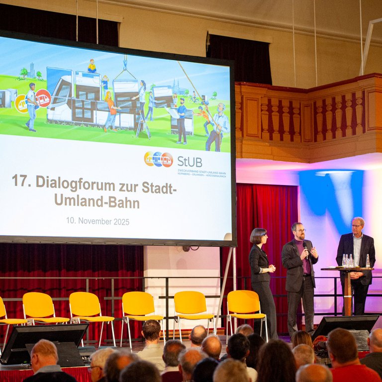 Das 17. Dialogforum zur Stadt-Umland-Bahn fand am Montag, 10. November 2025, in Erlangen statt. Rund 200 Interessierte nahmen an der Veranstaltung im Redoutensaal teil.