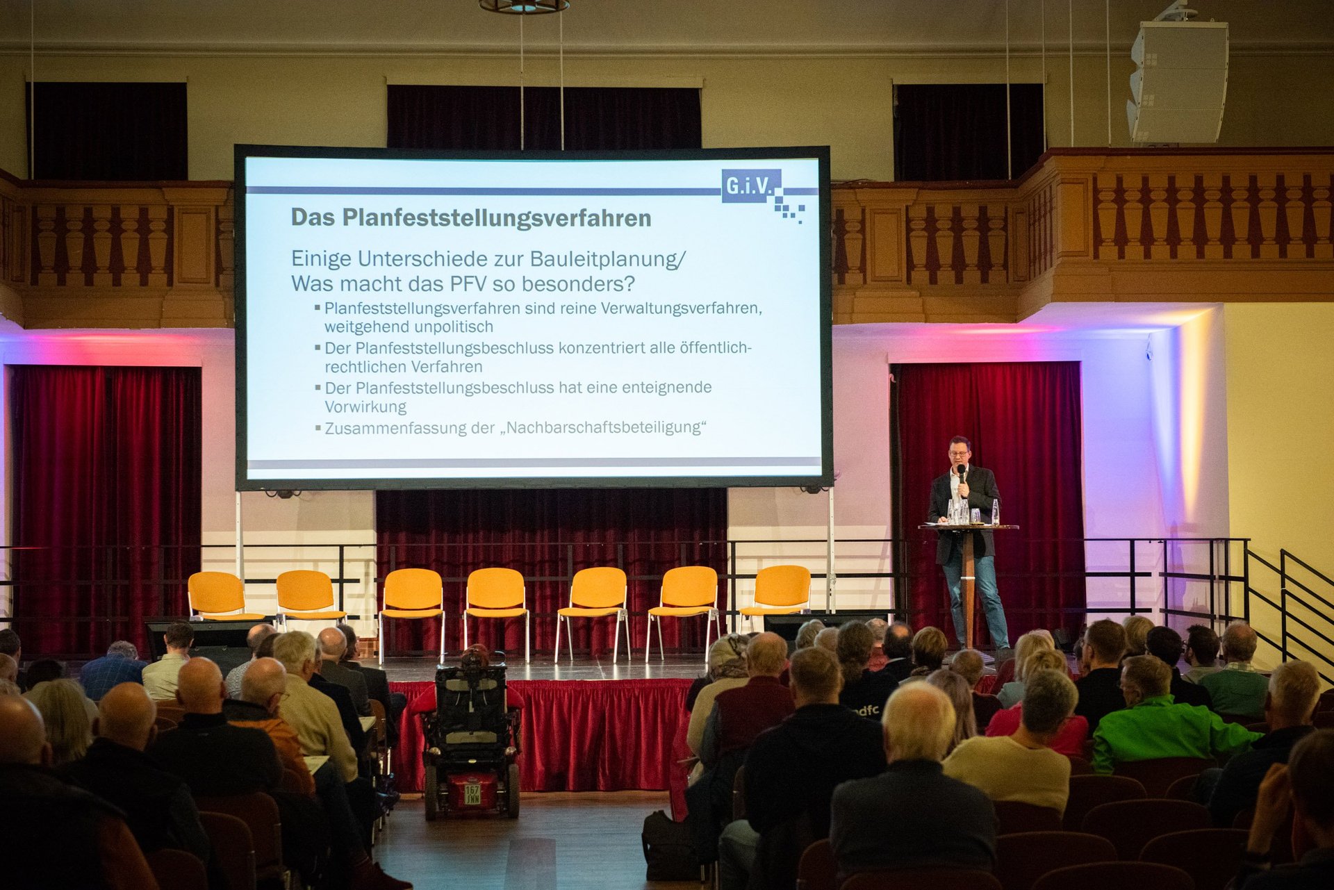 Nach der ausgiebigen ersten Fragerunde kamen wir zum zweiten inhaltlichen Teil des Abends. Gerhard Voss, Verfahrensbegleiter des ZV StUB und Berater in Sachen Planfeststellungsverfahren, nahm das Publikum mit in die inhaltliche Welt der Planfeststellungsverfahren.