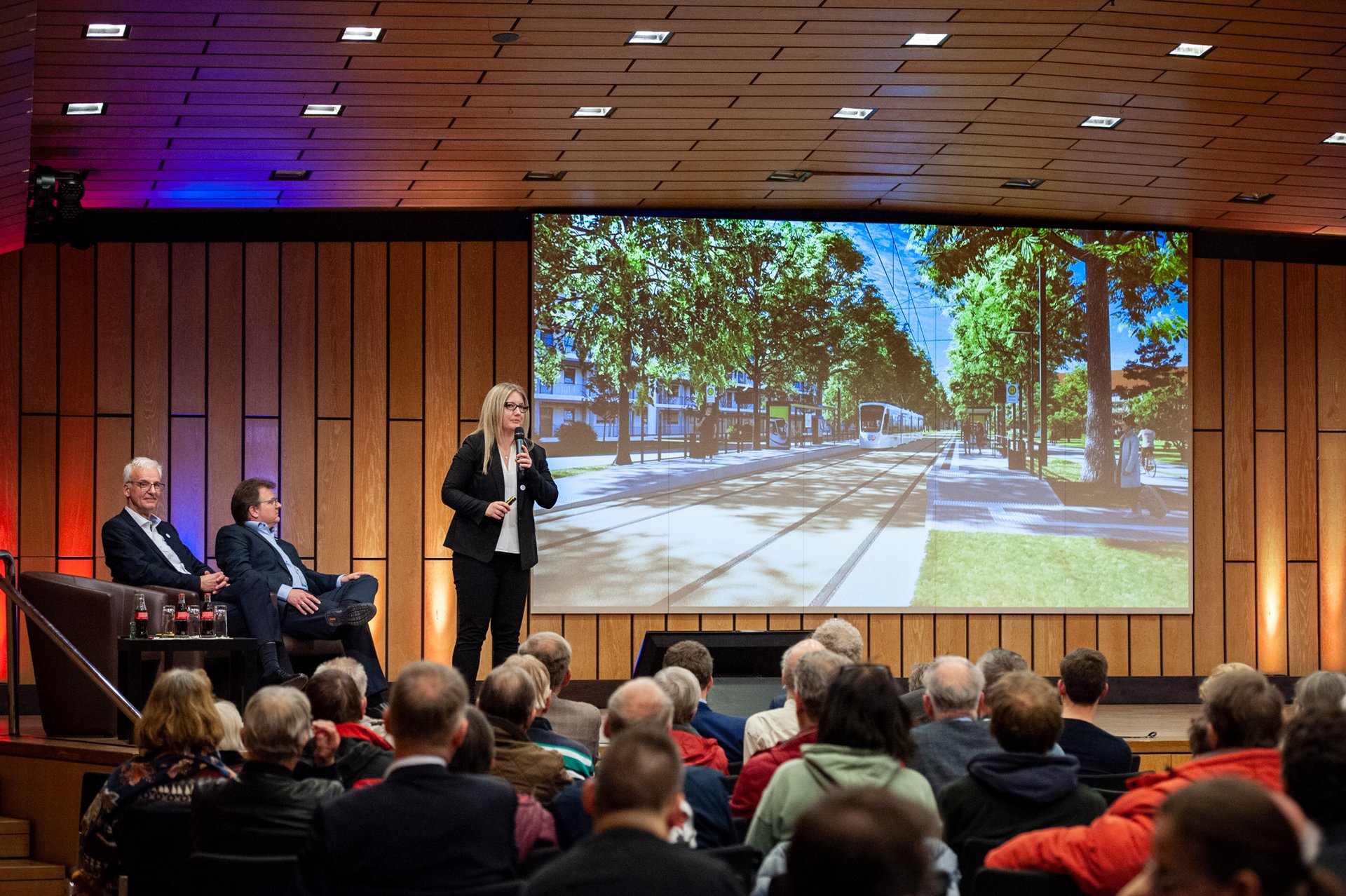 Die Infoveranstaltung zur Stadt-Umland-Bahn fand am 22. März 2023 in Erlangen (Heinrich-Lades-Halle) statt. Darin berichteten wir über die aktualisierte Standardisierte Bewertung und deren positive Auswirkungen auf unser Projekt. Mehr als 200 Bürger*innen nahmen vor Ort bzw. digital per Livestream an der Veranstaltung teil.
