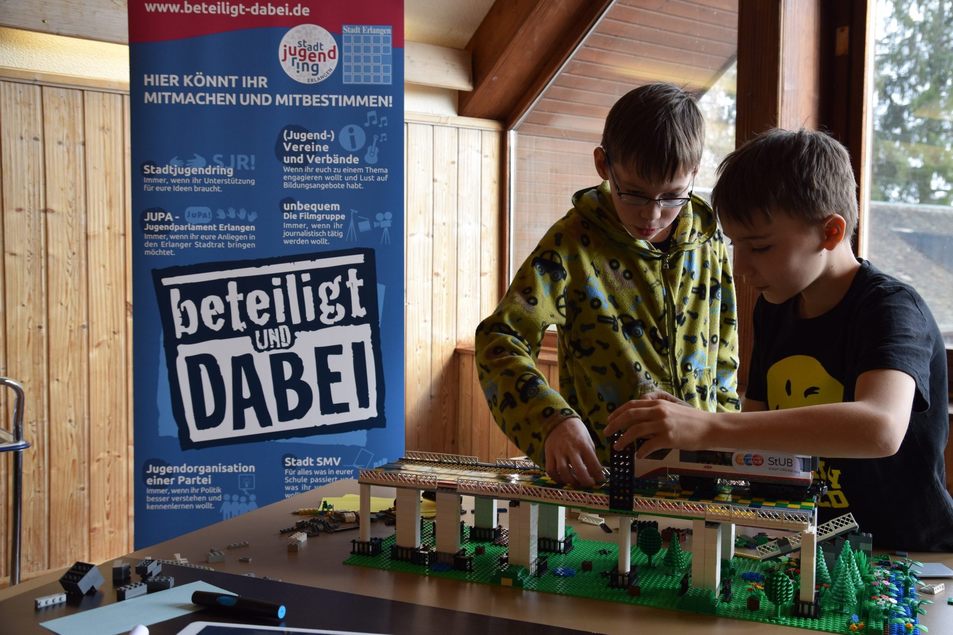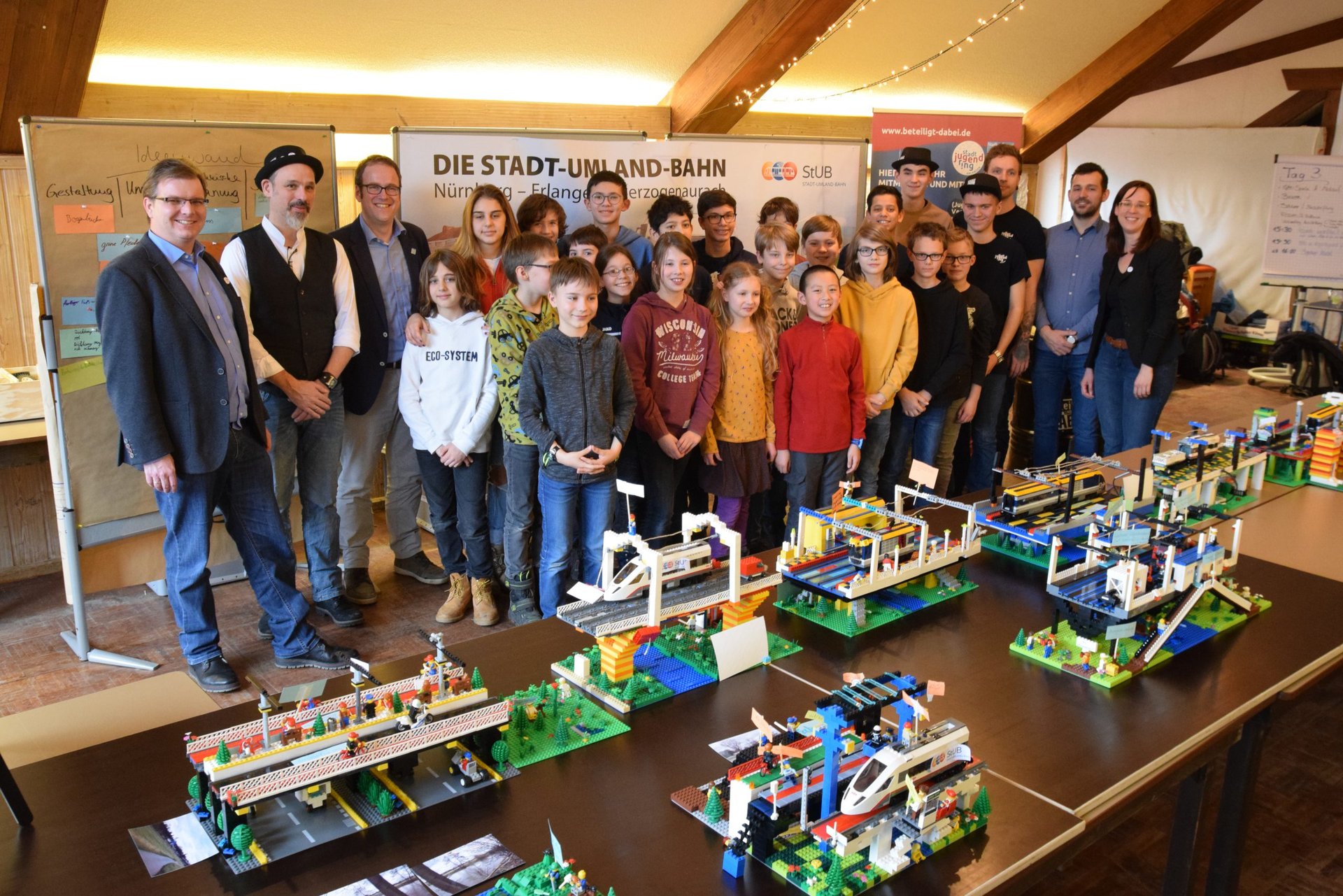 20 Kinder und Jugendliche im Alter von 10 bis 15 Jahren nahmen an der zweiten Planungswerkstatt unter dem Motto „Lego-Architekt*innen für die StUB gesucht“ teil. An den drei Tagen in den Faschingsferien planten die Teilnehmenden den Streckenabschnitt der Stadt-Umland-Bahn zur Querung des Erlanger Regnitzgrundes: Sie studierten aktuelle Pläne zur Linienführung, besichtigten den Regnitzgrund vor Ort und machten Fotos, um im Anschluss mit Lego-Bausteinen eine Brücke zu gestalten.