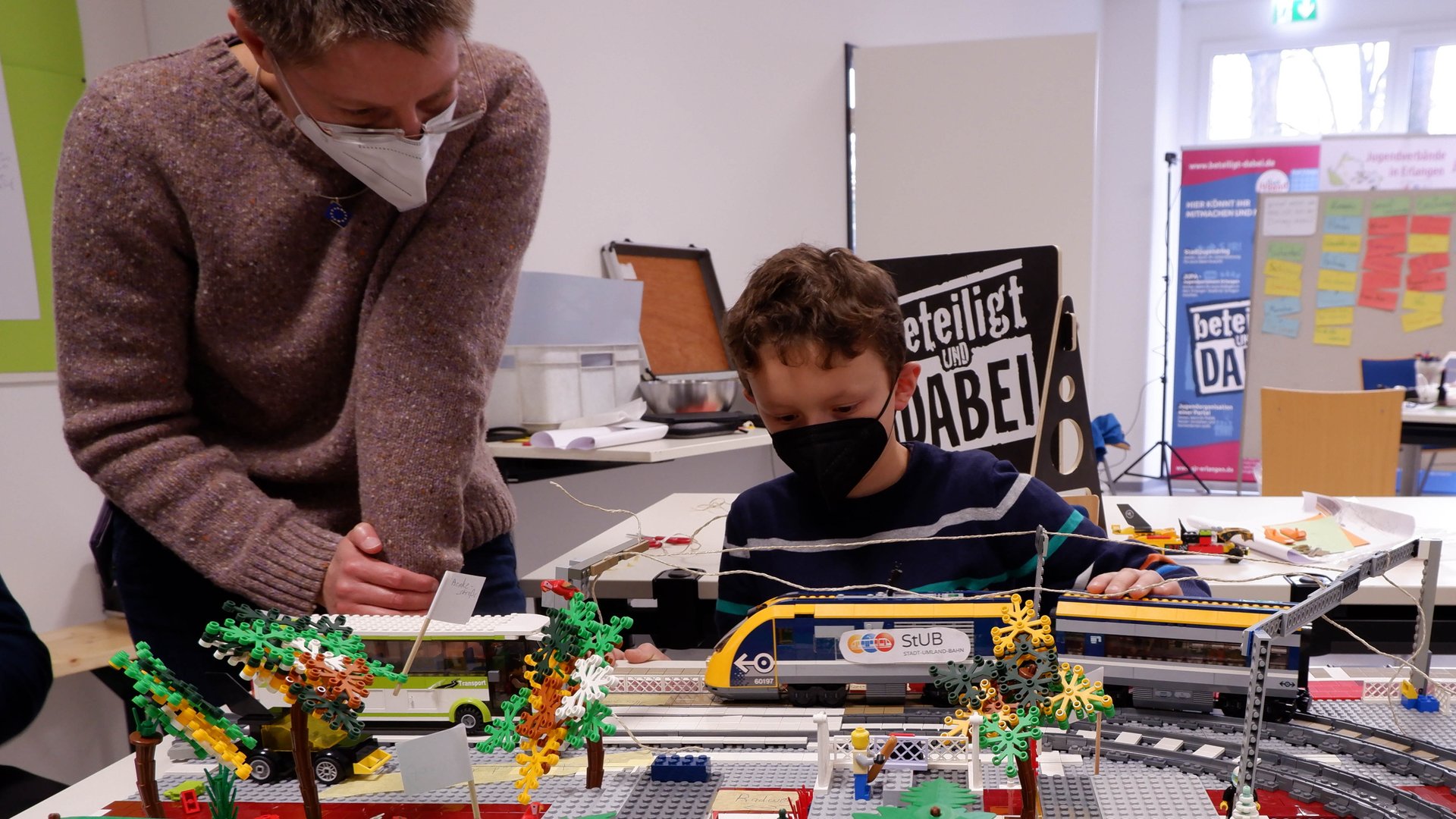 13 Kinder und Jugendliche im Alter von 10 bis 13 Jahren nahmen an der 5. Planungswerkstatt unter dem Motto „Lego-Architekt*innen für die StUB gesucht“ teil. An den drei Tagen in den Herbstferien planten die Teilnehmenden den Streckenabschnitt der Stadt-Umland-Bahn am Erlanger Langemarckplatz: Sie studierten aktuelle Pläne zur Linienführung, erhielten eine Einführung in die technischen Rahmenbedingungen des Straßenbahnprojekts und besichtigten den Langemarckplatz sowie einen vergleichbaren Streckenabschnitt des Nürnberger Straßenbahnnetzes vor Ort. Im Anschluss setzten sie ihre Ideen mit Lego-Bausteinen um und gestalteten ihre eigene StUB.