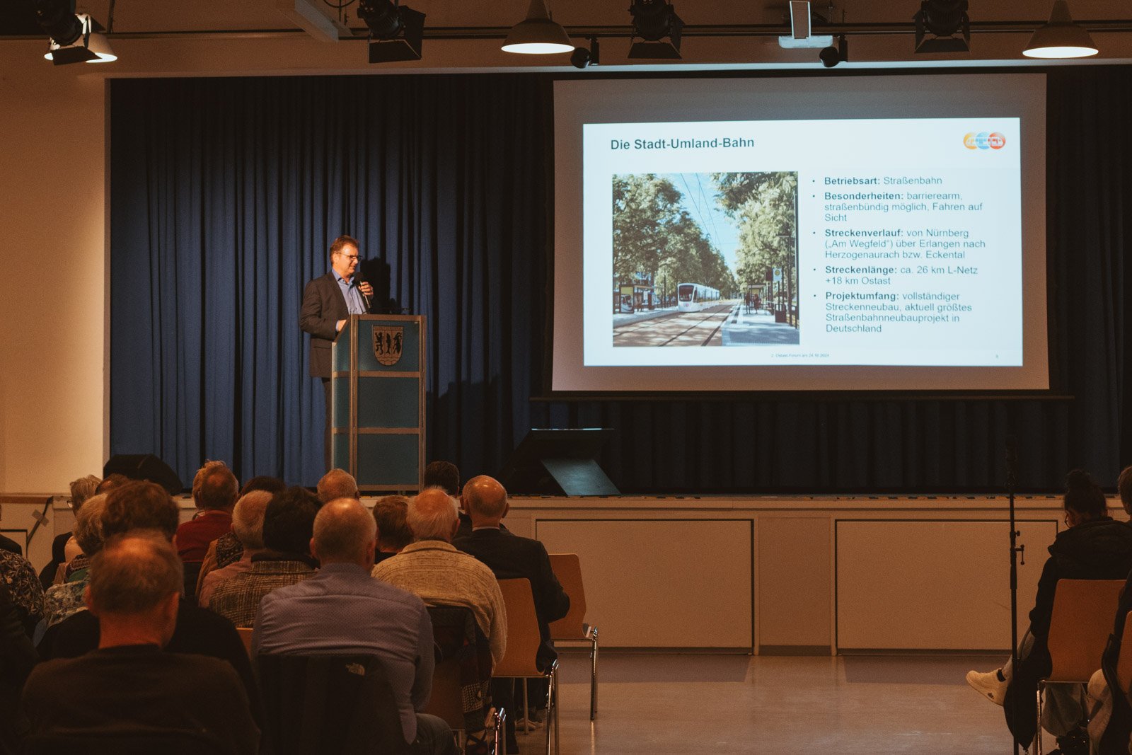 Anschließend übernahm unser Kaufmännischer Leiter und Ostast-Spezialist Daniel Große-Verspohl. Während der 90-minütigen Veranstaltung erläuterte er den rund 18 km langen Streckenverlauf durch die angrenzenden Ostastgemeinden: Der Ostast knüpft am Langemarckplatz in Erlangen am L-Netz der StUB an und führt über Spardorf, Buckenhof, Uttenretuh, Dormitz, Neunkirchen am Brand und Kleinsendelbach bis nach Eckental. Dabei sollen zukünftig auch die umliegenden Gemeinden Hetzles, Marloffstein und Weißenlohe sowie Heroldsberg, Igensdorf und die Stadt Gräfenberg profiteren.