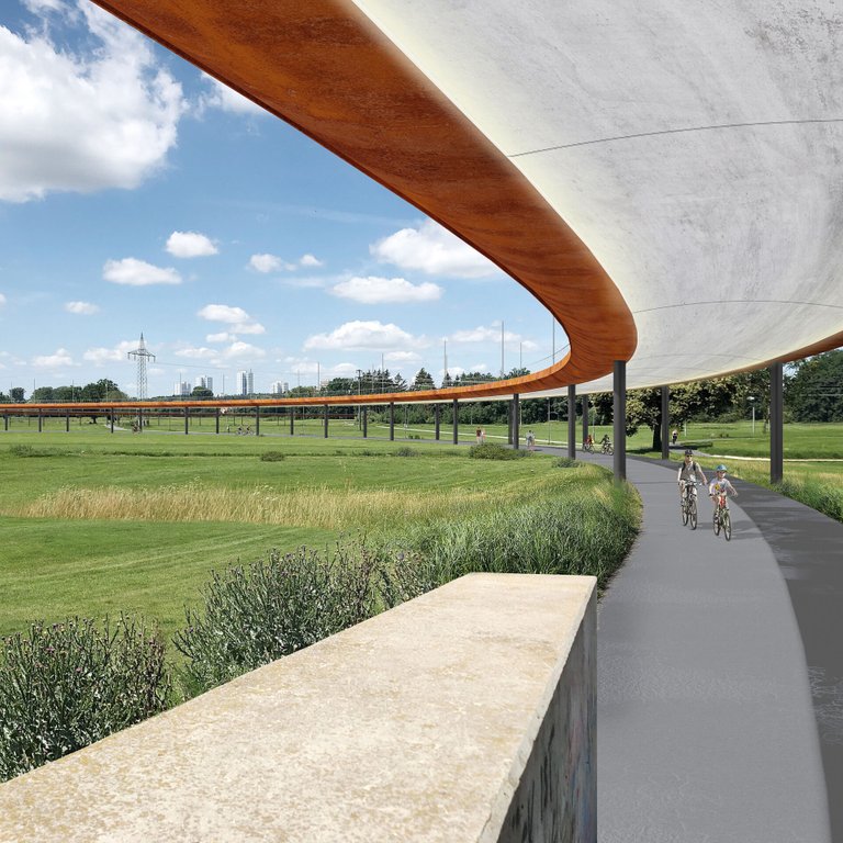 Mit dem unbehandelten, wetterfesten Stahl für die Längsträger des Brückenüberbaus kommt ein nachhaltiger Baustoff zum Einsatz. Die rostbraune Patina wirkt dabei ästhetisch und wirkt gerade in der reduzierten Längsansicht als hervorstechendes, architektonisches Merkmal. Der wetterfeste Stahl benötigt keinen Korrosionsschutz, was sich in der Wirtschaftlichkeit der Konstruktion niederschlägt. Die Erhöhung der Überzüge zur Erzielung größerer Spannweiten an den Flussquerungen liegen gut und verträglich dort, wo sie durch den Baumbestand eingebunden werden. Der Anschluss an den Tunnel unter der A 73 mit einem verdichteten Baumbestand ist gut gelöst. Höhe, Proportionalität und Materialität sind begründet und stimmig.
