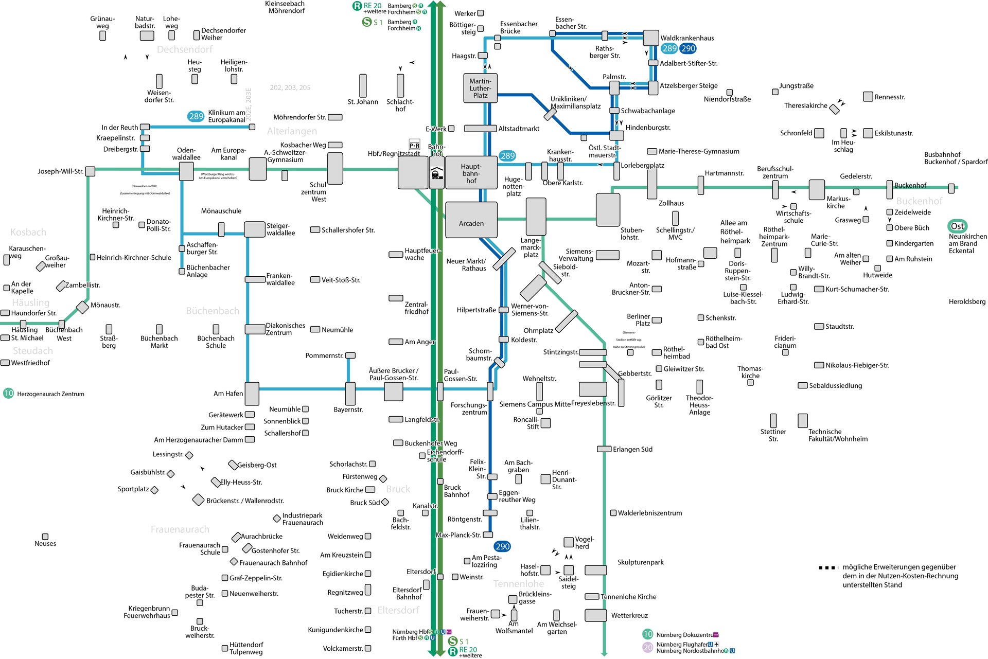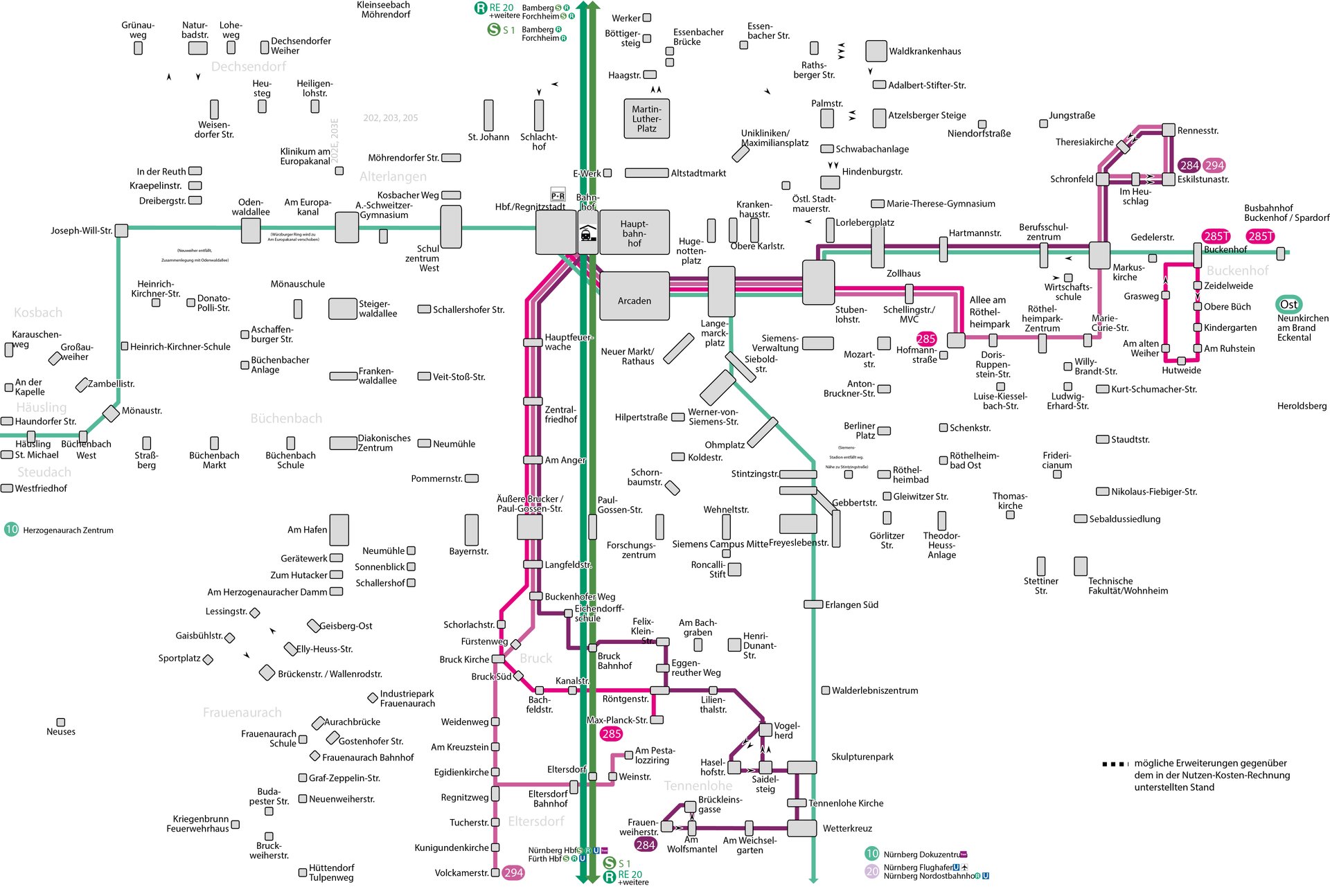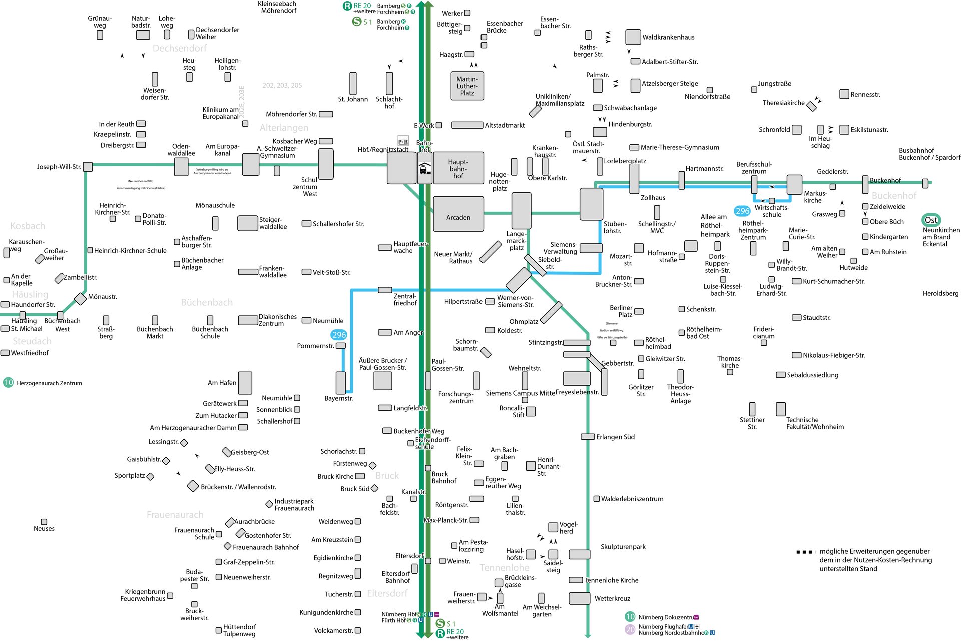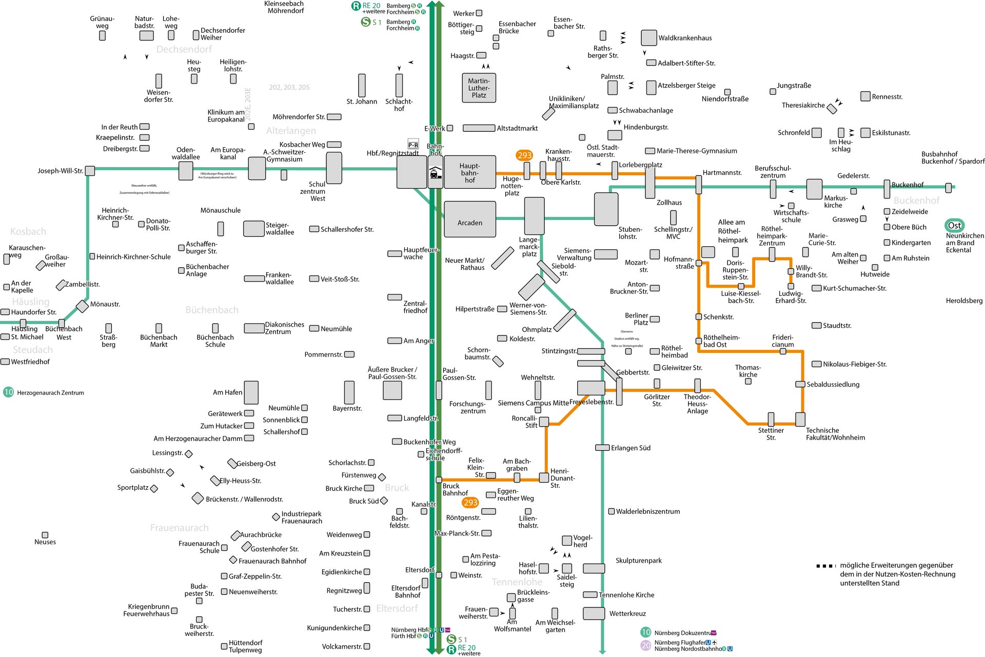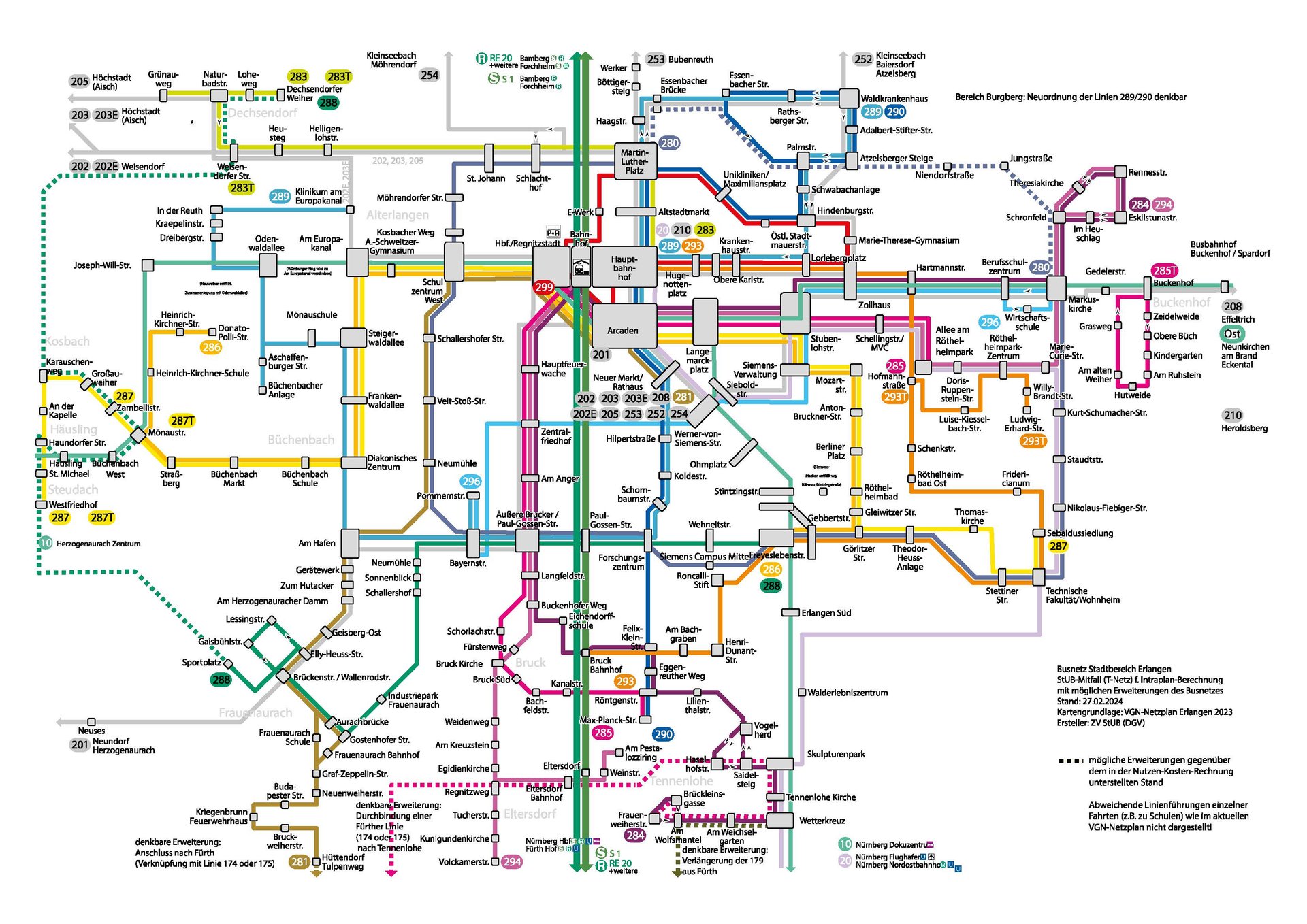 - Möglichkeit der Erweiterung um eine Entwicklung einer äußeren bzw. vollständigen Ringbuslinie in Erlangen